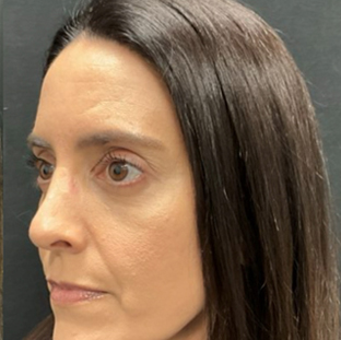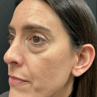 To address these changes, she underwent lower lid blepharoplasty to remove excess fat, fat transfer to the lower lid/cheek junction, and TCA chemical peel to improve lower lid skin texture.