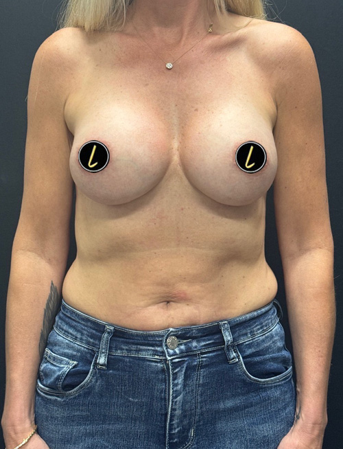 51 -year-old woman 6 weeks after bilateral subfascial breast augmentation with moderate profile Allergan 445 cc smooth round silicone implants and Durasorb (internal bra)