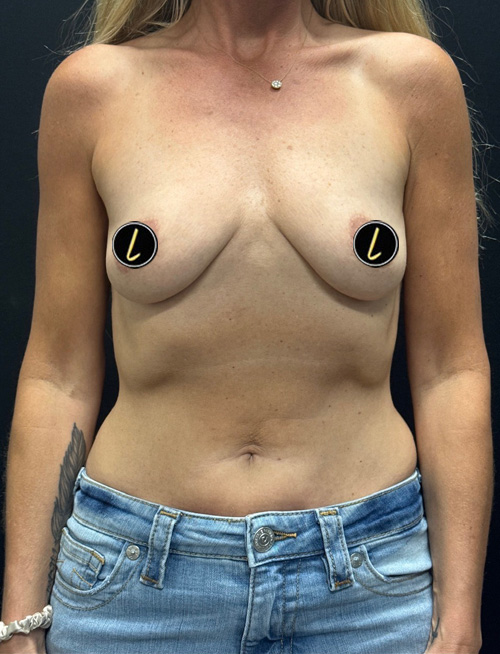 38 year old woman shown 1 month after bilateral subfascial breast augmentation with 340 cc Motiva round Demi profile silicone gel implants