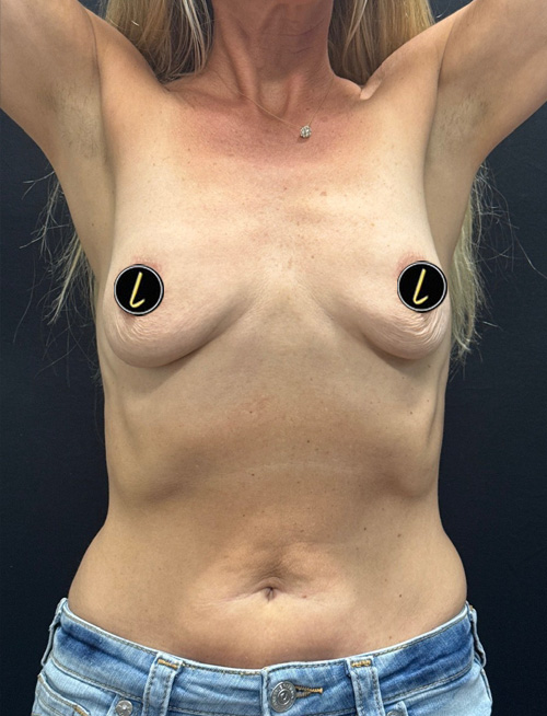42 year old woman shown 1 month after bilateral subglandular breast augmentation with mini profile Motiva implants. 245 right and 230 cc left