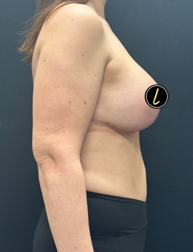 48 year old woman shown 1 month after implant exchange with 425 cc Motiva Demi profile implant , breast capsule revision and Durasorb.