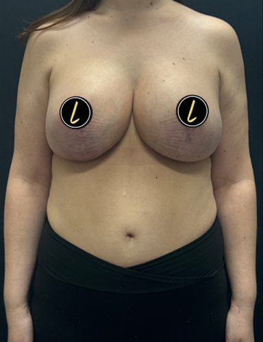 Patient is shown 1 month after bilateral breast implant exchange to 500 cc round full Motiva profile implants, Durasorb (internal bra) support and repositioning to split muscle pocket