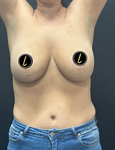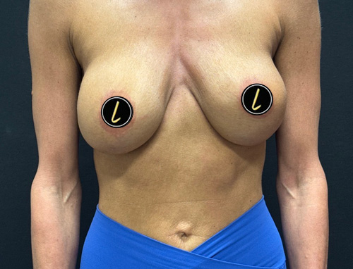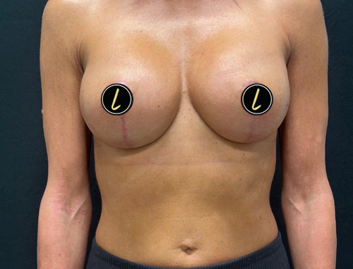 A woman in her 30s is shown several months after implant exchange to subfascial plane. Augmentation was done with 500 cc Motiva full profile round implants and Durasorb (internal bra)