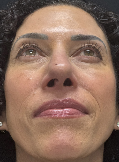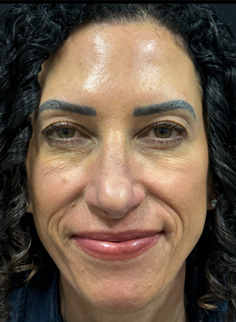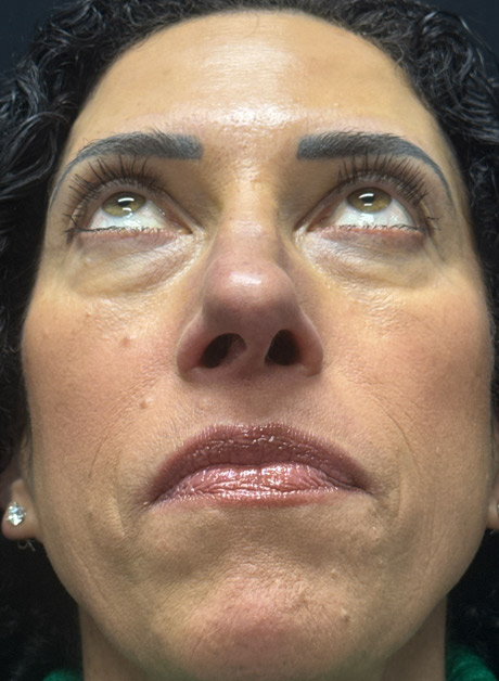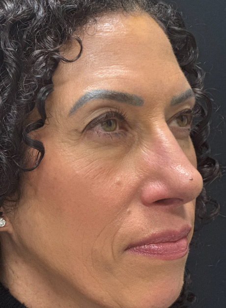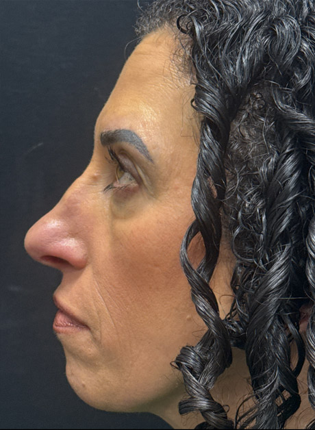 49 year old woman is shown 8 months after rhinoplasty to correct “dorsal hump” deformity.